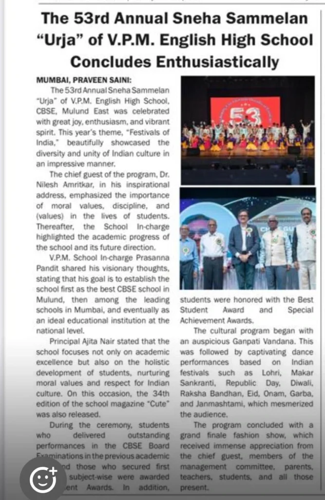 The 53rd Annual Sneha Sammelan URJA of VPM English High School, CBSE, Mulund East was celebrate with great joy, enthusiasm and vibrant spirit. This year’s theme,”FESTIVALS OF INDIA” beatifully showcased the diversity and unity of indian culture in an impressive manner. The Chief guest of the progam, Dr.Nilesh Amritkar in his inspirational address emphasised the importance of moral values, discipline, and values in the lives of students.